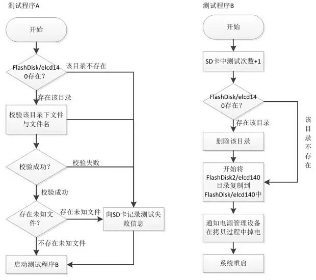 使用智能定時(shí)器控制被測(cè)設(shè)備電源,使用測(cè)試軟件A監(jiān)測(cè)文件系統(tǒng)狀況,測(cè)試軟件B進(jìn)行數(shù)據(jù)拷貝操作,在拷貝過(guò)程中對(duì)設(shè)備隨機(jī)斷電,如此往復(fù)以模擬Flash寫(xiě)入時(shí)掉電,軟件運(yùn)行流程如下圖所示。