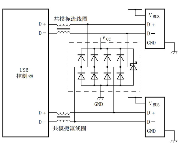 下圖為PRTR5V0U4D在雙路USB應(yīng)用中的連接示意圖。