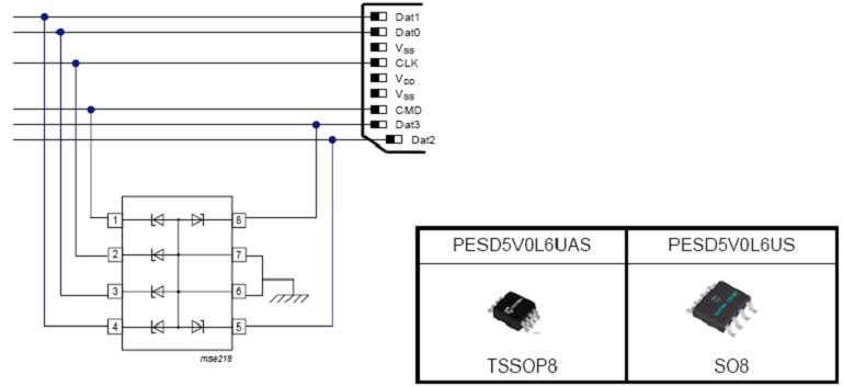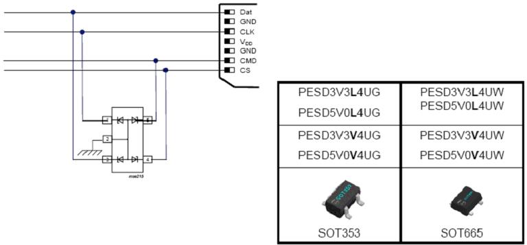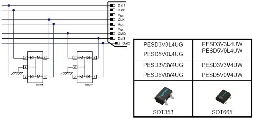 下圖為PESD3V3L4Ux / PESD5V0V4Ux 在SD卡保護電路中的連接示意圖。