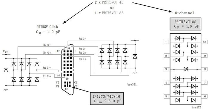 USB1.1、USB2.0、SD卡、MMC卡等接口,因為用戶使用中經(jīng)常性熱插拔,板上的芯片非常容易受靜電影響。這種應(yīng)用場合不能使用普通的穩(wěn)壓管等信道進行保護,因為穩(wěn)壓管的反應(yīng)速率太慢、且容性負載較大,會影響信道上的數(shù)據(jù)通信。NXP特提供以下方案供客戶參考。