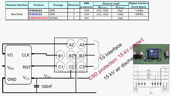 下圖為IP系列ESD保護器件在SIM卡保護電路中的連接示意圖。
