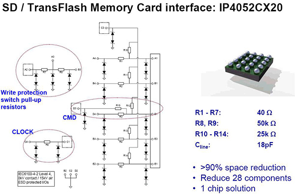 下圖為IP系列ESD保護器件在SD/MMC多媒體卡保護電路中的應(yīng)用示意圖。