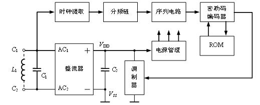 非接觸式射頻卡由時鐘提取、分頻鏈、序列電路、密勒碼產(chǎn)生器、整流器、調(diào)制器、電源管理、存儲器幾個部分組成,如圖2所示。