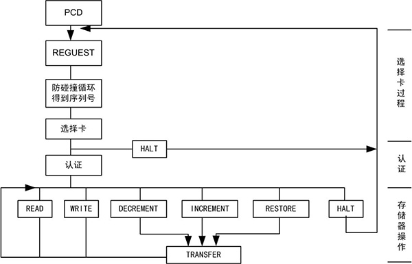 PCD發(fā)送REQUEST命令給所有在天線場范圍內(nèi)的非接觸式卡,通過防碰撞循環(huán),得到一個卡的序列號,選擇此卡進(jìn)行鑒別認(rèn)證,通過后對存儲卡進(jìn)行操作,如圖3所示。