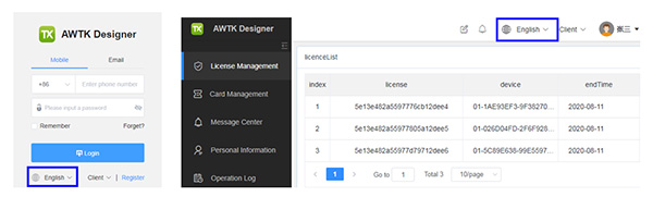 AWTK云平臺的注冊和登錄頁面均可切換英文版網(wǎng)頁,可滿足習(xí)慣閱覽英文的用戶需求。