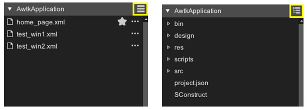 項(xiàng)目管理器窗口支持簡潔模式與常規(guī)模式之間的切換,簡潔模式下僅顯示UI文件列表,并支持修改啟動(dòng)頁面和打開樣式文件。