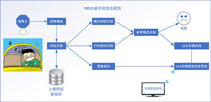 DMS(Driver Monitor Status )防疲勞預(yù)警系統(tǒng):利用DMS攝像頭獲取的圖像,通過視覺跟蹤、目標(biāo)檢測、動作識別等技術(shù)對駕駛員的駕駛行為及生理狀態(tài)進(jìn)行檢測,當(dāng)駕駛員發(fā)生疲勞分心、打電話、抽煙、未系安全帶等危險情況時在系統(tǒng)設(shè)定時間內(nèi)報警以避免事故發(fā)生。