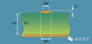 在下圖中,是單端導(dǎo)線的截面圖,阻抗與H1成正比,與Er成反比,與W1、W2、T1成反比,大家可以看出,W1,W2,T1是一個(gè)梯形面,這三個(gè)參數(shù)組成的就是導(dǎo)體截面,實(shí)際阻抗與導(dǎo)線截面積成反比。也就是說,特性阻抗是與導(dǎo)體截面積、導(dǎo)體到參考平面的距離和導(dǎo)體到參考平面間介質(zhì)的介電常數(shù)有關(guān)的。