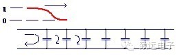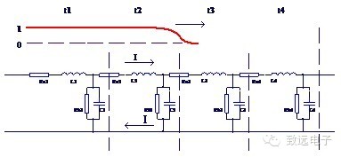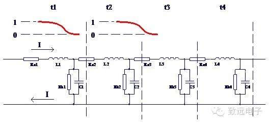 在上圖里,以t1時(shí)間段來說,電阻Ra1的阻值很小,電感L1也很小,電容C1也很小,電阻Rb1很大。電信號從低電平變高電平高電平,它不是整條導(dǎo)線上一下子就變?yōu)楦唠娖搅?,而是像錢塘江大潮漲潮或波浪推進(jìn)時(shí),是有一個(gè)過程的。錢塘江大潮來后,就把江面從低水位變到高水位了,波浪是一個(gè)一個(gè)的來,就像高頻信號不停的傳輸。信號電場也如潮水一樣,它是后面的推前邊的,前面的繼續(xù)向前。