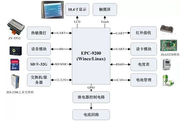 充電樁內(nèi)部設(shè)備較多,且大部分是RS-232接口,如果每一個設(shè)備都使用一條電纜接到工控主板上,則會使內(nèi)部電路相當(dāng)復(fù)雜,可靠性和電磁兼容性也會大打折扣。采用CAN總線通信,可以降低信號線復(fù)雜度,還可方便擴(kuò)展更多設(shè)備。使用廣州致遠(yuǎn)電子股份有限公司的EPC-9200產(chǎn)品方案如下圖2.1所示。
