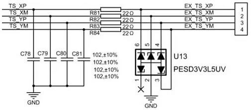 四線電阻觸摸屏接口電路如圖4所示,為防止觸摸屏受干擾而出現(xiàn)較大識(shí)別誤差,加入了低通濾波電路;需注意電容 C78~C81選型,容值不能超過(guò)0.01μF,否則觸摸屏反映遲鈍或無(wú)法正常識(shí)別,建議取值1nF。