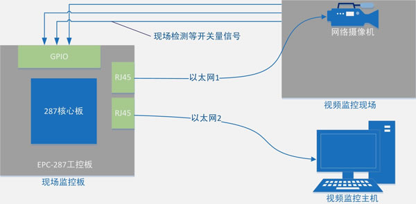 基于EPC-287工控板,筆者做過如圖1所示的項目應用,其中便使用了EPC-287雙以太網(wǎng)的三端口交換機功能,其中一個內(nèi)置端口由EPC-287使用,另外兩個端口分別連接到外部的網(wǎng)絡攝像機和視頻監(jiān)控主機。