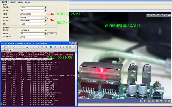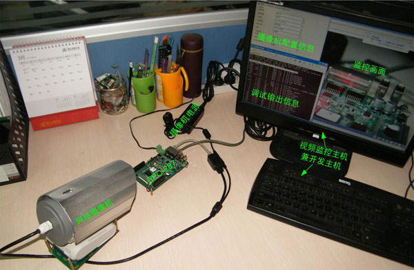 系統(tǒng)工作的時候,EPC-287將現(xiàn)場采集到的監(jiān)控數(shù)據(jù)通過交換機內(nèi)置端口發(fā)送給網(wǎng)絡攝像機,網(wǎng)絡攝像機則將監(jiān)控數(shù)據(jù)與現(xiàn)場視頻進行OSD處理后再通過交換機傳輸?shù)揭曨l監(jiān)控主機。如圖2所示,便是在工作臺上調(diào)試系統(tǒng)時的場景。