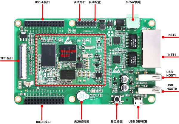如圖4所示是EPC-287工控板的正面外觀及主要資源分布。主板采用Freescale工業(yè)級Arm926EJ-S?內(nèi)核的i.MX287處理器,主頻高達454MHz。