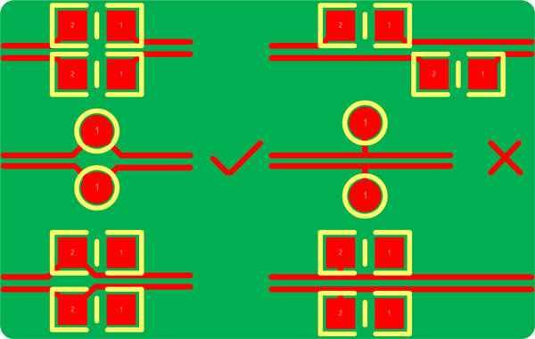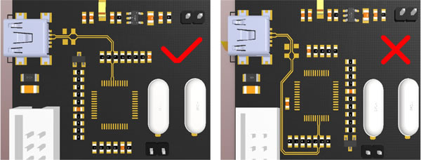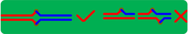 3. 對稱平行走線,這樣能保證兩根線緊耦合,避免90°走線,弧形或45°均是較好的走線方式(√為合理的方式,×為不合理方式);