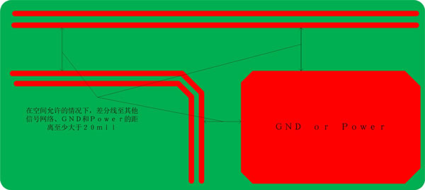 6. 為了減少串?dāng)_,在空間允許的情況下,其他信號網(wǎng)絡(luò)及地離差分線的間距至少20mil(20mil是經(jīng)驗值),覆地與差分線的距離過近將對差分線的阻抗產(chǎn)生影響;
