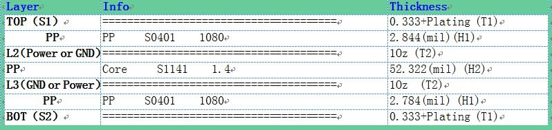 下圖為四層板的參考疊層,其中中間兩層為參考層,參考層通常為GND或Power,并且差分線所對應(yīng)的參考層必須完整,不能被分割,否則會導(dǎo)致差分線阻抗不連續(xù)。若是以圖 2疊層設(shè)計四層板,通常設(shè)計時差分線采用4.5mil的線寬及5.5mil的線間距既可以滿足差分阻抗90Ω。然而4.5mil線寬及5.5mil線間距只是我們理論設(shè)計值,最終電路板廠依據(jù)要求的阻抗值并結(jié)合生產(chǎn)的實(shí)際情況和板材會對線寬線間距及到參考層的距離做適當(dāng)?shù)恼{(diào)整。