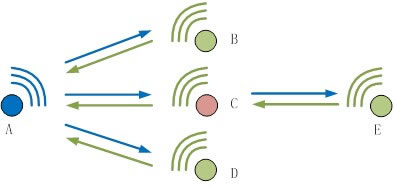 3、如圖9所示,當主從節(jié)點的距離無法直接通訊時,只需將兩點距離中一個節(jié)點(如C點)設(shè)置成路由模式,則能完成數(shù)據(jù)轉(zhuǎn)發(fā),其他所有設(shè)置均和第2點的設(shè)置一樣。