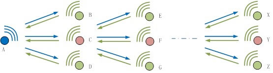 4、由以上三種基本網(wǎng)絡(luò),拓展出更復(fù)雜的網(wǎng)絡(luò),如下圖10所示,多級組網(wǎng)通訊。FastZigbee協(xié)議應(yīng)對該網(wǎng)絡(luò)同樣也是得心應(yīng)手,使用方式完全和第3點的設(shè)置一樣,只需將鏈路中無法達到的距離中間,找個節(jié)點,設(shè)置成路由模式即可。FastZigbee最大支持10級路由轉(zhuǎn)發(fā),單級路由最大2.5KM,能夠滿足絕大部分的網(wǎng)絡(luò)。