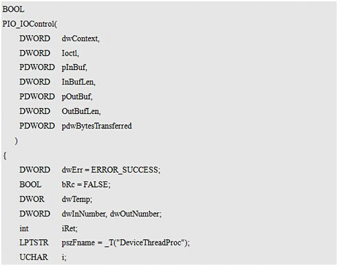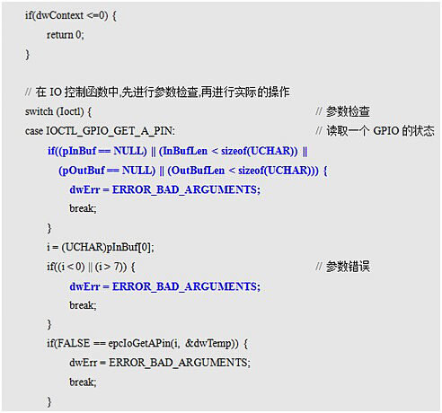 以WinCE下某一開源的GPIO驅(qū)動為例,截取IOControl部分的代碼,如程序清單1所示;請留意代碼突出顯示部分。