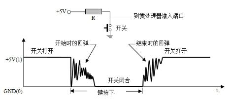 鍵盤的基本電路是一個接觸開關(guān),通、斷兩種狀態(tài)分別表示邏輯“0”和“1”。如圖2所示,當(dāng)開關(guān)打開時,處理器檢測到相應(yīng)引腳為高電平,表示邏輯“1”;當(dāng)開關(guān)閉合時,處理器檢測到相應(yīng)引腳為低電平,表示邏輯“0”。