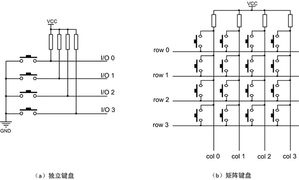 設(shè)計鍵盤時,通常小于4個按鍵的應(yīng)用,可以使用獨(dú)立式接口。如果按鍵較多,為了減少微處理器的I/O端口的占用,可以使用矩陣式鍵盤。