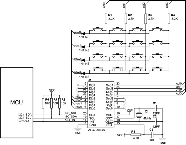 另外,如果使用處理器I/O直接與矩陣鍵盤接口相連,上述矩陣鍵盤的檢測方式需要處理器不斷對接口掃描檢測。對速度較快的處理器來說,這種檢測方式是對處理器的極大浪費(fèi)。所以實(shí)際應(yīng)用中建議使用專門的矩陣鍵盤的驅(qū)動芯片或I/O擴(kuò)展芯片,來實(shí)現(xiàn)對矩陣鍵盤的檢測,比如ZLG7290、CAT9555等擴(kuò)展芯片。使用驅(qū)動或I/O擴(kuò)展芯片,可以將處理器從簡單但頻繁的鍵盤掃描動作中解放出來。如圖4為ZLG7290實(shí)現(xiàn)矩陣鍵盤應(yīng)用的基本電路,該芯片支持2×8個I/O擴(kuò)展,采用IIC接口與處理器連接,并支持中斷輸出,最大可擴(kuò)展8×8的矩陣鍵盤。