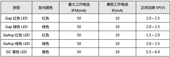 使用不同材料(管芯材料)的LED,其正向電壓也有所不同,在設(shè)計(jì)電路前要先了解一下它們的基本特性,參考如表1所列。