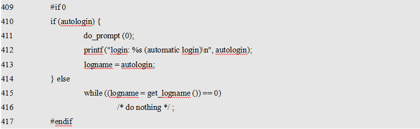 同時,把mingetty.c文件中的第409~415行注釋掉,修改如下: