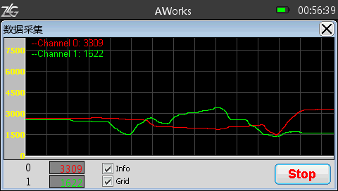 “數(shù)據(jù)采集”對兩路AD數(shù)據(jù)變化進行歷史曲線顯示。如圖 12所示。