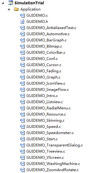 emWin模擬器提供了全部的源碼,用戶可根據(jù)實際LCD的分辨率修改模擬器的屏幕分辨率。模擬器附帶的Demo源碼極具參考價值,幾乎涵蓋了emWin中所有的控件使用,用戶通過學習這些例程,并參考官方的emWin手冊,可快速入門emWin的開發(fā)。Demo源碼如圖 2所示: