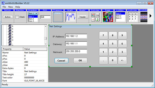 GUIBuilder是emWin附帶的一款無需使用C語言編程即可創(chuàng)建對話框的工具,并提供了豐富的控件,用戶只需在GUIBuilder中通過拖拽控件,擺放控件的位置和調(diào)整控件的大小,還可以在上下文菜單中設置各控件的屬性,將設計的界面另存為C文件,可以直接拿到emWin工程中使用,生成的C代碼中還自動添加了事件處理框架,用戶只需關注事件的處理上。讓用戶從為設計一個界面而反復修改代碼,燒錄,運行,再修改的痛苦中解放出來。
