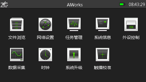 M1052核心板板載16MB SDRAM,完全滿足開發(fā)emWin高清圖形應用的條件。M1052配套的AWorksLP SDK軟件包,已經(jīng)為用戶配置好LCD屏驅(qū)動,用戶無需關心底層驅(qū)動的實現(xiàn),可直接啟動emWin應用程序的開發(fā)。并提供一款精簡的桌面UI系統(tǒng)Demo程序,給用戶一定的參考,使用戶能夠快速開發(fā)自己的桌面應用程序。Demo酷炫主界面如圖 5所示:
