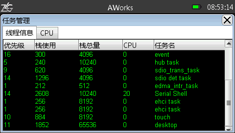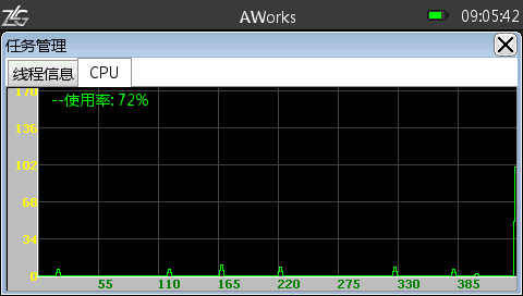 “任務管理”可對系統(tǒng)中各任務的優(yōu)先級,堆棧信息,CPU占用率數(shù)據(jù)進行預覽。并以歷史曲線記錄CPU的占用率。如圖 8、圖 9所示。