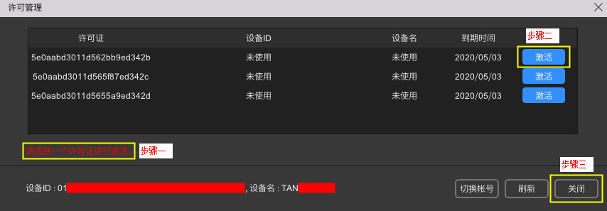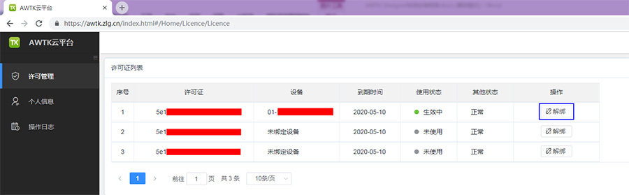 在許可管理頁面可以查看許可證、許可證綁定的設(shè)備、到期時間、使用狀態(tài)等。默認(rèn)一個許可證只能在一個設(shè)備(如電腦)上使用,如果需要在另外一臺設(shè)備上使用同一個許可證,請點擊下圖中的“解綁”按鈕進行解綁,如圖1.15所示。