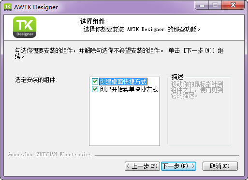 選擇要安裝的組件,如:是否創(chuàng)建桌面和開始菜單快捷方式。選擇好之后,點擊“下一步(N)”按鈕,繼續(xù)安裝,如圖1.3所示。