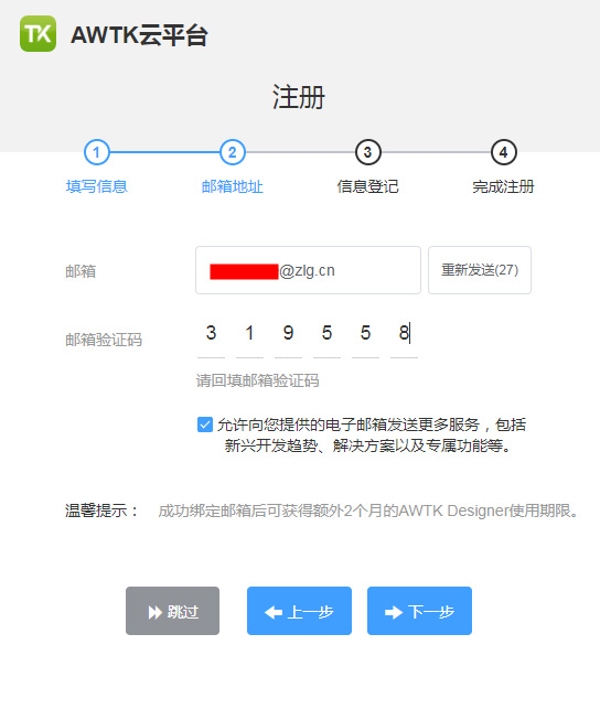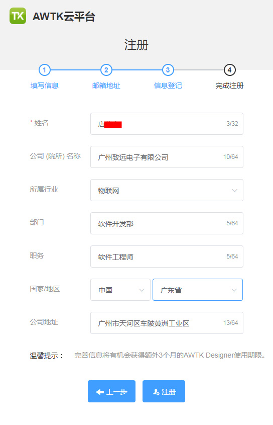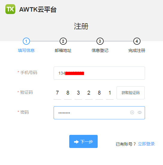 在AWTK云平臺頁面下,點擊下面的“注冊”,將會打開注冊頁面,如圖1.6所示。