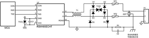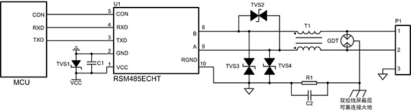 如圖 1所示的保護(hù)電路,氣體放電管將接口處的大部分浪涌電流泄放,共模電感濾除共模信號(hào)的干擾,TVS進(jìn)一步降低氣體放電管后的殘壓,從而保護(hù)后級(jí)電路。RSM485ECHT模塊應(yīng)用圖 1所示保護(hù)電路可以達(dá)到接觸靜電±8kV,共模浪涌±4kV,差模浪涌±2kV,滿足大部分工業(yè)現(xiàn)場(chǎng)對(duì)RS-485節(jié)點(diǎn)靜電和浪涌等級(jí)的要求。