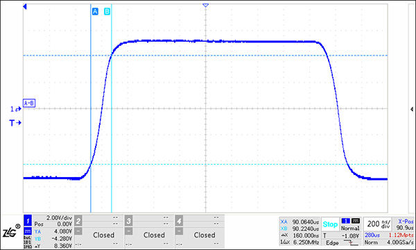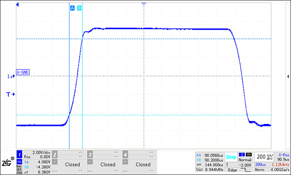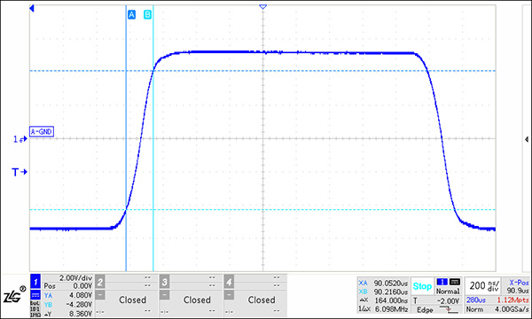 當(dāng)通信節(jié)點(diǎn)數(shù)較多,可以使用如圖 8所示保護(hù)電路,其A-RGND或B-RGND的結(jié)電容僅為20pF,雖然TVS結(jié)電容較大,但普通二極管結(jié)電容非常小,TVS與普通二極管的結(jié)電容為串聯(lián)關(guān)系,因此可以減小保護(hù)電路的結(jié)電容。使用圖 8進(jìn)行圖 3所示的組網(wǎng),測(cè)試點(diǎn)1的波形如圖 9所示,測(cè)試點(diǎn)6波形如圖 10所示,波形基本未發(fā)生變化。