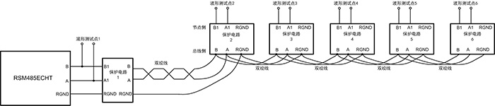 圖 2所示為RSM485ECHT單節(jié)點(diǎn)發(fā)送波形,圖 3為RS-485總線接6個(gè)保護(hù)電路的示意圖,每個(gè)節(jié)點(diǎn)之間的距離在30cm左右,使用雙絞線手拉手連接,圖 4和圖 5分別為在總線上接6個(gè)圖 1所示電路的波形測(cè)試點(diǎn)1和波形測(cè)試點(diǎn)6(圖 3中標(biāo)注的位置)的波形,波形的上升/下降時(shí)間變長(zhǎng),并且波形測(cè)試點(diǎn)1波形變成了臺(tái)階形狀。