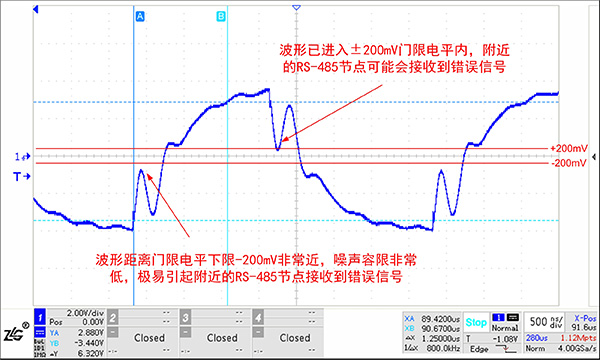 RSM485ECHT的RS-485接口驅(qū)動(dòng)能力較強(qiáng),如下為使用相同測(cè)試條件測(cè)試市場(chǎng)上常用的RS-485收發(fā)器芯片測(cè)試波形,可以看出其波形已被嚴(yán)重干擾,且反射波形已到達(dá)RS-485芯片門(mén)限電平附近,有可能引起通信異常。因此在實(shí)際應(yīng)用中應(yīng)選擇驅(qū)動(dòng)能力較強(qiáng)的收發(fā)器。
