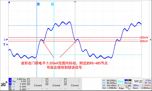 當(dāng)信號(hào)在通信線上傳輸,到達(dá)RS-485節(jié)點(diǎn)上的保護(hù)電路時(shí),保護(hù)電路的結(jié)電容使信號(hào)受到的瞬時(shí)阻抗發(fā)生變化,一部分信號(hào)將被反射,另一部分發(fā)生失真并繼續(xù)傳播下去。