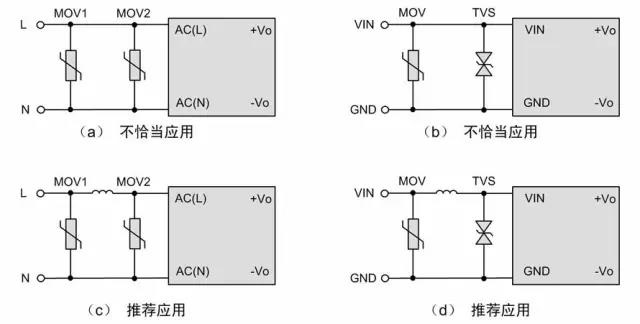 如圖1所示,為提高輸入級的浪涌防護(hù)能力,在外圍增加了壓敏電阻和TVS管。但圖中的電路(a)、(b)原目的是想實現(xiàn)兩級防護(hù),但可能適得其反。如果(a)中MOV2的壓敏電壓和通流能力比MOV1低,在強(qiáng)干擾場合,MOV2可能無法承受浪涌沖擊而提前損壞,導(dǎo)致整個系統(tǒng)癱瘓。同樣的,電路(b),由于TVS響應(yīng)速度比MOV快,往往是MOV未起作用,而TVS過早損壞。所以正確的接法一般是如圖(c)、(d)所示,在兩個MOV或是MOV和TVS之間接一個電感,將防護(hù)器件分隔成兩級。