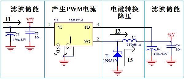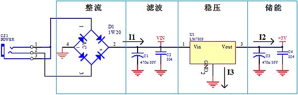從圖上可知,線性電源有整流、濾波、穩(wěn)壓、儲能等功能元件組成,同時,一般用的線性電源為串聯(lián)穩(wěn)壓電源,輸出電流等于輸入電流,I1=I2+I3,I3是參考端,電流很小,因此I1≈I3。我們?yōu)槭裁匆v電流,是因為PCB設(shè)計時,每條線的寬度不是隨便設(shè)的,是要根據(jù)原理圖里元件節(jié)點間的電流大小來確定的(請查《PCB設(shè)計銅鉑厚度、線寬和電流關(guān)系表》)。電流大小、電流流向要搞清楚,做板才恰到好處。