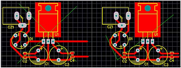 PCB設(shè)計時,元件的布局要緊湊,要讓所有的連線盡可能短,要按原理圖元件功能關(guān)系去布局元件與走線。本電源圖里就是先整流、再濾波、濾波后才是穩(wěn)壓、穩(wěn)壓后才是儲能電容、流經(jīng)電容后才給后面的電路用電。圖二是上面原理圖的PCB圖,兩個圖相似。左圖和右圖就是走線有點不一樣,左圖的電源經(jīng)整流后直接就到了穩(wěn)壓芯片的輸入腳了,然后才是穩(wěn)壓電容,這里電容所起的濾波效果就差了很多,輸出也有問題。右圖就是比較好的圖了。我們不僅要考慮正電源的流向問題,還必須考慮地回流問題,一般來說,正電源線和地回流線要盡可能同進(jìn)同出,彼此離近點。