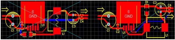 開關(guān)電源PCB設(shè)計時,需要注意的地方是:反饋線的引入點、續(xù)流二極管是給誰續(xù)流。從圖三可以看出,U1導(dǎo)通時,電流I2進(jìn)入電感L1,電感的特性是電流在電感里流過時不能突然產(chǎn)生,也不能突然消失,電流在電感里的變化時有一個時間過程的。在脈沖電流I2流過電感的作用下,有部分電能轉(zhuǎn)換成磁能,電流逐漸增大,到一定時候,控制電路U1關(guān)斷了I2,由于電感的特性,電流不能突然消失,這時候二極管起作用了,它接替電流I2,所以叫續(xù)流二極管,可以看出,續(xù)流二極管是給電感用的,續(xù)流的電流I3是從C3的負(fù)端出發(fā),經(jīng)D1,L1后流入C3的正端,這里就相當(dāng)于抽水機(jī),利用電感的能量,把電容C3的電壓提高了。還有就是電壓檢測的反饋線引入點問題,應(yīng)該是經(jīng)過濾波后的地方反饋回去,不然會使輸出的電壓紋波更大。這兩點是我們很多PCB設(shè)計人員經(jīng)常忽視的地方,以為同一個網(wǎng)絡(luò),接在那兒不是一樣,其實接的地方不一樣,性能影響是很大的。圖四是LM2575開關(guān)電源PCB圖,大家看看錯的那幅圖是哪里錯了。