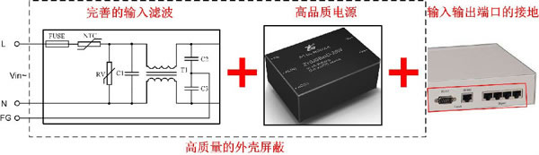 上圖描述的是一個比較完備的設(shè)計(jì)方案,但在實(shí)際應(yīng)用時,設(shè)計(jì)者會以最低的成本及最快捷的手段獲得較好的EMC性能。所以選用高品質(zhì)的電源是解決產(chǎn)品EMC性能最有效的手段,同時也能縮短設(shè)計(jì)者的研發(fā)周期,贏得先機(jī)搶占市場。