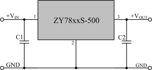ZY78xxS系列的應(yīng)用簡單,一般情況下無需外接任何器件即可直接使用,為更進(jìn)一步改善輸入反射紋波,輸出紋波噪聲,可在輸入、輸出端各加一個(gè)電容,以ZY7805S-500為例,如圖4所示。