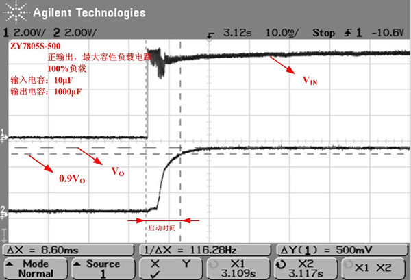 輸出接最大容性負(fù)載(100uF)時(shí),啟動(dòng)波形平滑,啟動(dòng)時(shí)間約8mS,輸出建立時(shí)間約3mS,如圖5所示。