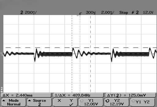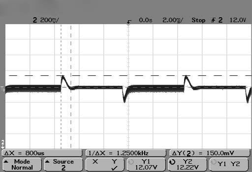 用示波器測量輸出電壓的過沖幅度及恢復時間,注意此時器件不能出現(xiàn)嘯叫。